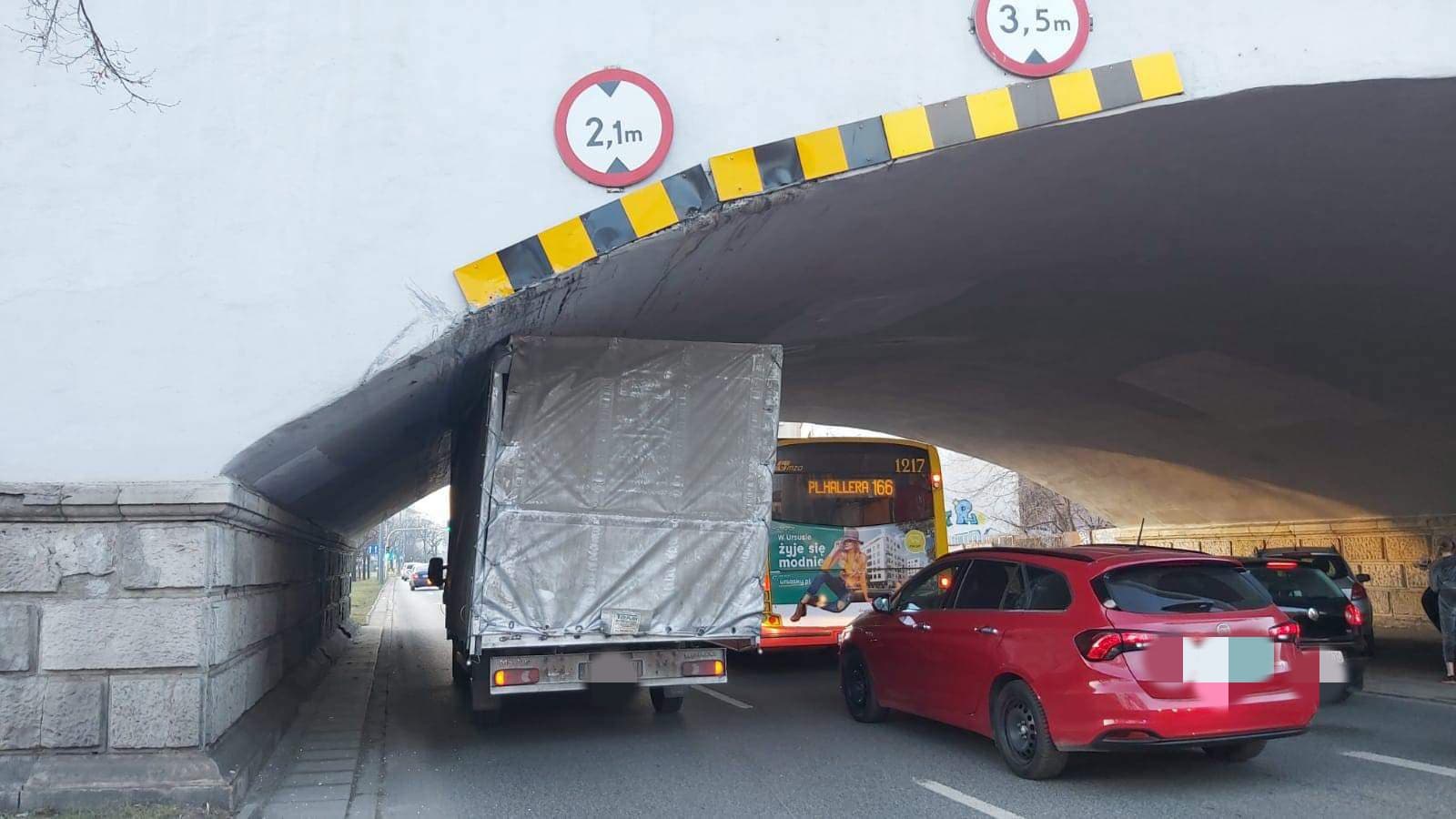 Na ulicy Targowej kierujący samochodem dostawczym zaklinował się pod wiaduktem kolejowym w kierunku Dworca Wileńskiego. Zablokowane są dwa pasy ruchu.