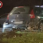 Samochód po zderzeniu wybił się na krawężniku, ściął słupki, drzewo i zatrzymał się na szczycie skarpy