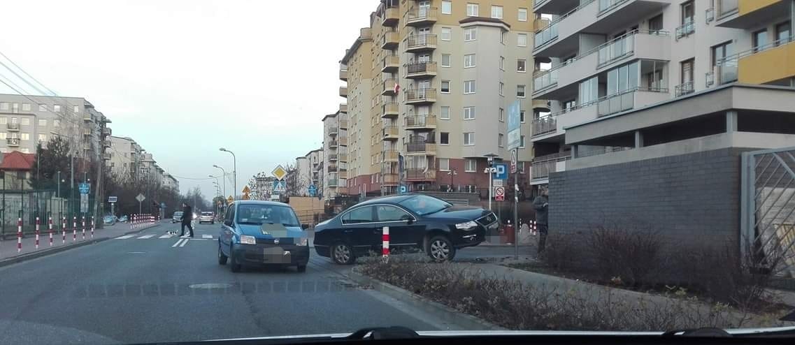 Na ulicy Skoroszewskiej w Ursusie doszło do zderzenia Volkswagena i Fiata po zderzeniu jedno z aut wjechało na słupek na, którym zawisło.