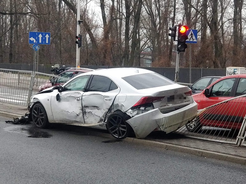 Ścięte barierki, sygnalizator, rozbite samochody. Poważne zderzenie trzech aut przy PGE Narodowym