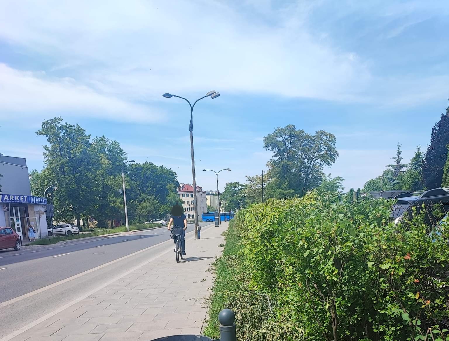Ścieżki rowerowe po obu stronach. Rowerzysta pędzi chodnikiem