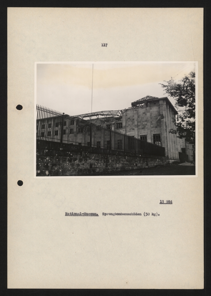 - Muzeum Narodowe. Uszkodzenia od bomby burzącej, a w szczególności uszkodzony górny świetlik.