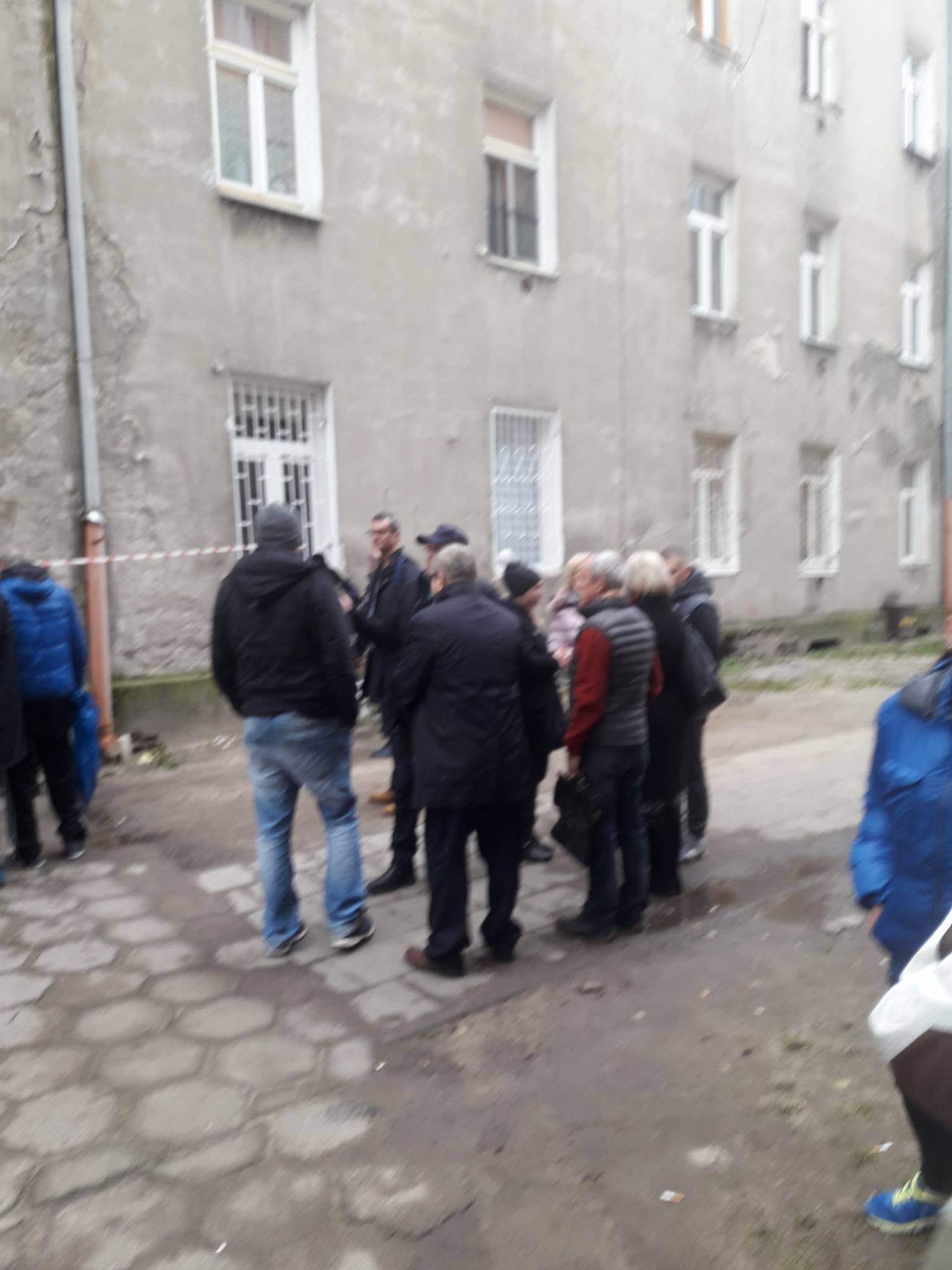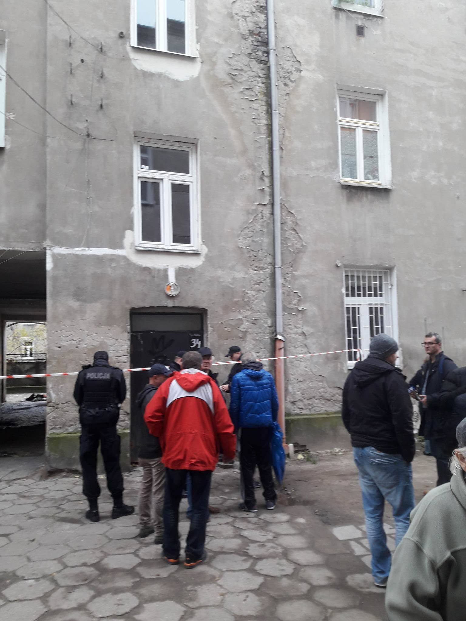 Przed chwilą w asyście policji lokatorzy zaczęli wchodzić do mieszkań po swoje rzeczy. Ludzie wchodzą pojedynczo i zabierają najpotrzebniejsze przedmioty.