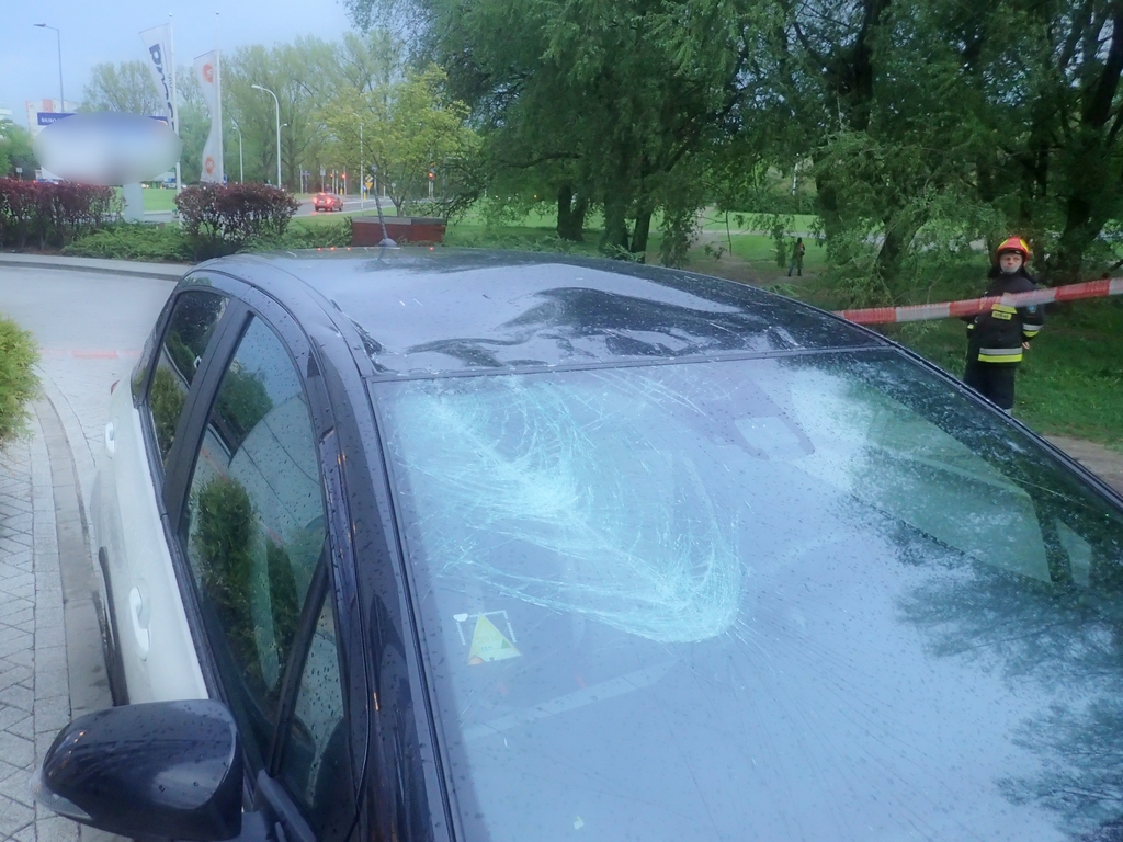 Jedna z nich uderzyła w podjeżdżający pod klatkę schodową samochód osobowy. Osoby uczestniczące w zdarzeniu na szczęście nie doznały żadnych obrażeń.