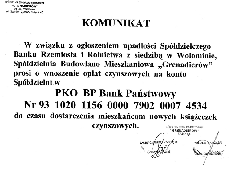 Jeden z naszych czytelników przesłał nam zdjęcie komunikatu, jaki został mu wrzucony do skrzynki pocztowej przez spółdzielnię SBM Grenadierów. Wynika z niego, ze z powodu ogłoszenia upadłości przez SK Bank Wołomin opłatę należy uiszczać na inny nr konta nich dotychczasowy, a poprzednie książeczki czynszowe stają się bezużyteczne. Czytelnik jest jednak zaniepokojony. Martwi się, że poprzednie czynsze wpłacane na konto przepadną, a on będzie musiał zapłacić je ponownie. Czy to możliwe?