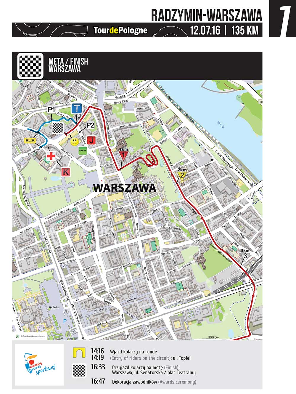Tegoroczny Tour de Pologne to siedem etapów i do pokonania aż 1190 kilometrów. Start honorowy wyścigu odbędzie się o godz. 13.20 na placu Konstytucji 3 Maja w Radzyminie. Peleton pojawi się m.in. na Krakowskim Przedmieściu, Nowym Świecie, w Alejach Ujazdowskich, na pl. Na Rozdrożu. Na trasie znajdują się też dwie górskie premie na ul. Karowej i Agrykoli oraz lotna premia na pl. Trzech Krzyży. Meta etapu będzie na pl. Teatralnym. Dekoracja zawodników odbędzie się po godz. 16.45.