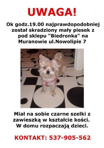 „Błagam udostępniajcie!!! Ok godz.19.00 najprawdopodobniej został skradziony mały piesek z pod sklepu „Biedronka” na Muranowie ul.Nowolipie 7 Miał na sobie czarne szelki z zawieszka w kształcie kości. W domu rozpaczają dzieci.” – napisała właścicielka psa