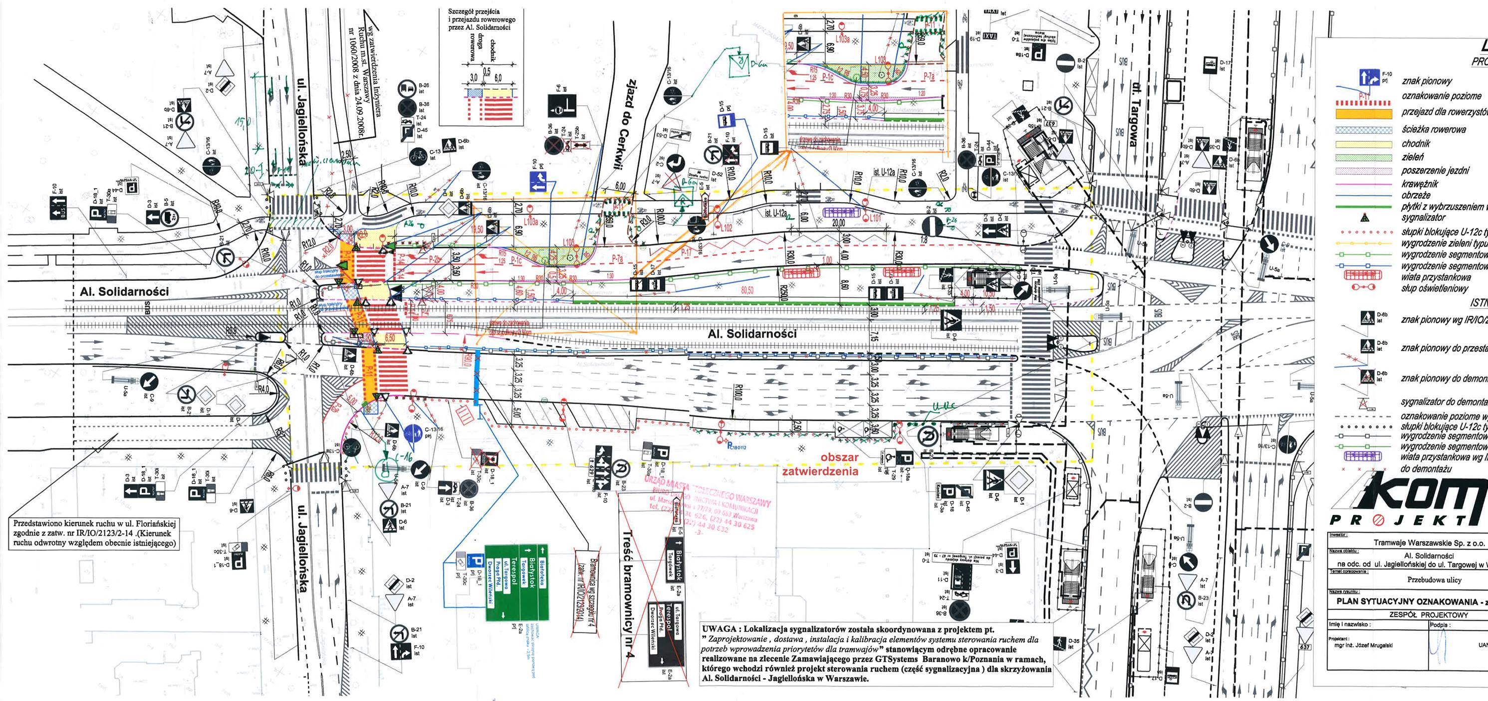 „Zarząd Dróg Miejskich Warszawa PS. Poniżej zamieszczamy zatwierdzony projekt organizacji ruchu dla skrzyżowania Jagiellońska+Solidarności,który przesłaliście do jednego z mieszkańców dn. 1.07.2016. Jest to fragment opublikowanego w całości dn. 22.07.2016 przez F6 zatwierdzonego projektu (tzw. zastępczego) stałej organizacji ruchu. Problem w tym, że zatwierdzony obszar został zaznaczony żółtą przerywaną linią i nie obejmuje kluczowych części skrzyżowania. Jeżeli zatem na podstawie tego projektu, ktoś zechce wprowadzać nową organizację ruchu na skrzyżowaniu, to musi się liczyć z konsekwencjami.” – odpowiada Floriańska 6