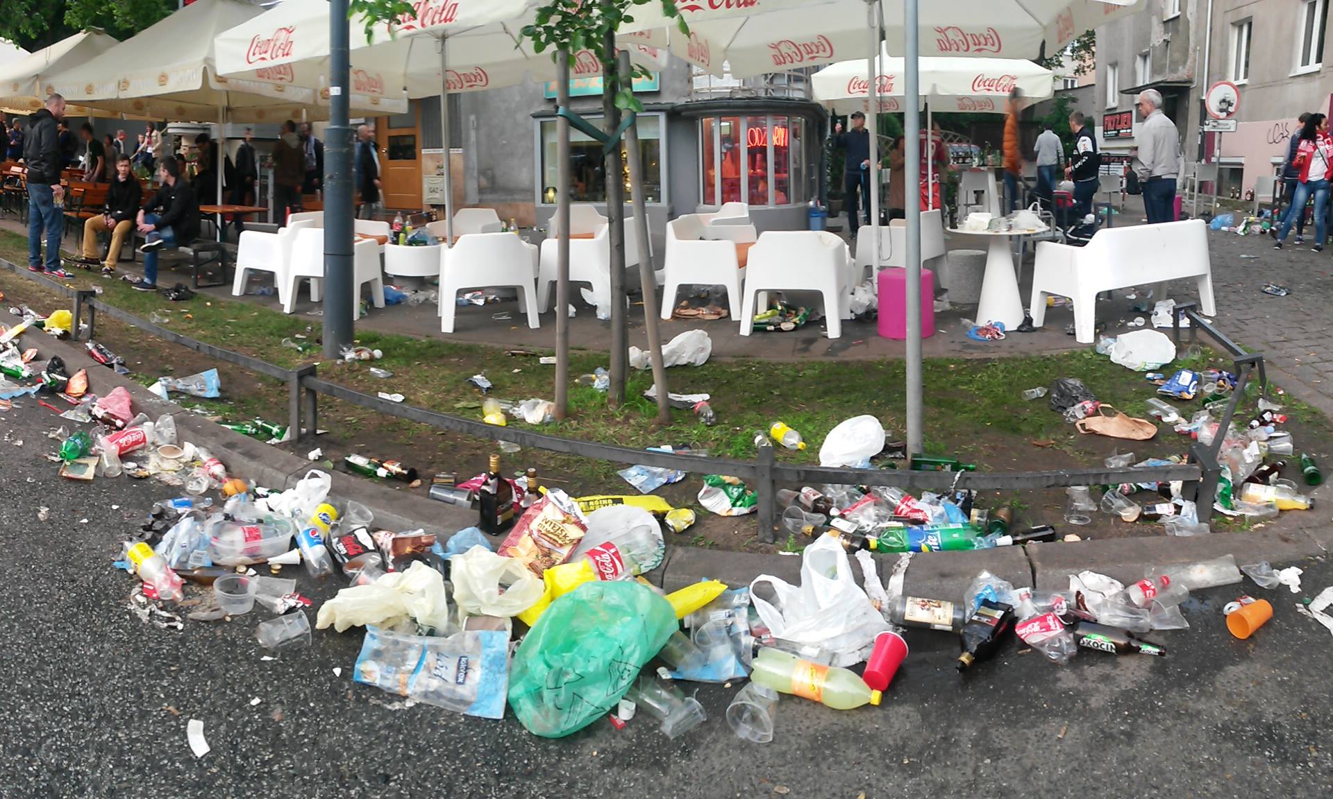 Krótko po 20.00 na ulicę Francuską wstąpiły służby porządkowe. Wszystko zostało już posprzątane, jednak, jak widać na załączonym zdjęciu hiszpańscy kibice zachowywali się co najmniej nagannie. Kosze były opróżniane co chwila, jednak służby nie nadążały za wyrzucaniem śmieci. Kibice zamiast jednak pozostawić odpadki przy koszach, wyrzucali je gdzie popadnie. Z jednej z najbardziej reprezentacyjnych ulic Saskiej Kępy w kilka minut zrobił się śmietnik.