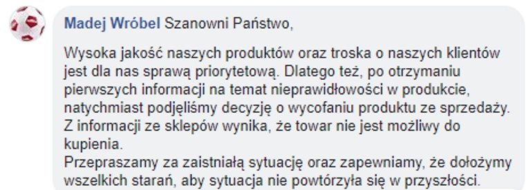 Wysoka jakość naszych produktów oraz troska o naszych klientów jest dla nas sprawą priorytetową. Dlatego też, po otrzymaniu pierwszych informacji na temat nieprawidłowości w produkcie, natychmiast podjęliśmy decyzję o wycofaniu produktu ze sprzedaży. Z informacji ze sklepów wynika, że towar nie jest możliwy do kupienia.