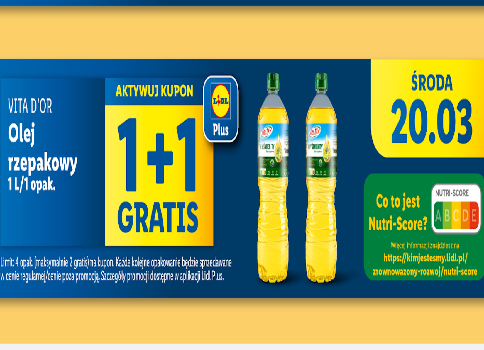 Lidl Polska uruchamia wyjątkową, jednodniową promocję, która z pewnością przyciągnie tłumy do sklepów sieci w najbliższą środę, 20.03.2024. W ramach tej promocji, przy aktywacji specjalnego kuponu w aplikacji Lidl Plus, klienci będą mogli skorzystać z oferty 1+1 gratis na olej rzepakowy VITA D’OR o pojemności 1 litra.