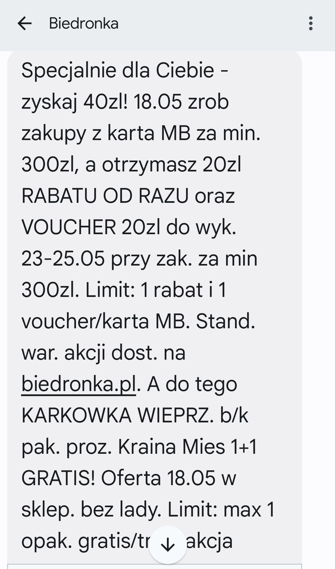 Zgodnie z treścią SMS-a, klienci, którzy dokonają zakupów za minimum 300 zł, otrzymają natychmiastowy rabat w wysokości 20 zł oraz voucher o tej samej wartości, który będzie można wykorzystać w dniach od 23 do 25 maja przy kolejnych zakupach za co najmniej 300 zł. Promocja ogranicza się do jednego rabatu i jednego vouchera na kartę Moja Biedronka, co podkreśla ekskluzywny charakter tej oferty.