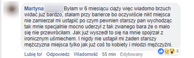 „Byłam w 6 miesiącu ciąży więc wiadomo brzuch widać już bardzo, stałam przy barierce bo oczywiście nikt miejsca nie zamierzał mi ustąpić po czym pewien starszy pan wychodząc tak mnie specjalnie mocno uderzył z tak zwanego bara że o mało się nie przewróciłam. Jak już wyszedł to się na mnie spojrzał z ironicznym uśmiechem. I nigdy nie ustąpił mi żaden starszy mężczyzna miejsca tylko jak już coś to kobiety i młodzi mężczyźni.” – pisze Pani Martyna.