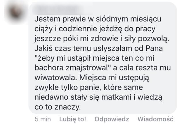 „Jestem prawie w siódmym miesiącu ciąży i codziennie jeżdżę do pracy jeszcze póki mi zdrowie i siły pozwolą. Jakiś czas temu usłyszałam od Pana „żeby mi ustąpił miejsca ten co mi bachora zmajstrowal” a cała reszta mu wiwatowala. Miejsca mi ustępują zwykle tylko panie, które same niedawno stały się matkami i wiedzą co to znaczy.” – pisze Nasza Czytelniczka.