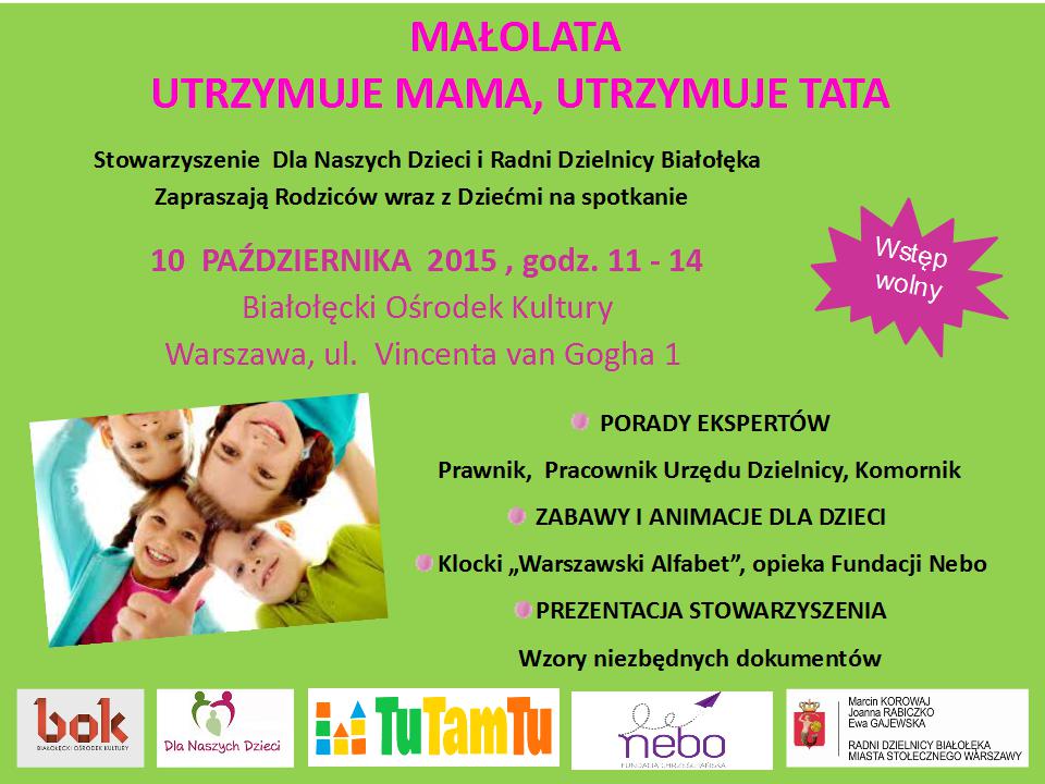 Stowarzyszenie Dla Naszych Dzieci oraz Radni dzielnicy Białołęka (Ewa Gajewska, Joanna Rabiczko, Marcin Korowaj) zapraszają na spotkanie dla samodzielnych rodziców, których dzieci nie otrzymują alimentów. Spotkanie pod hasłem „Małolata utrzymuje Mama, utrzymuje Tata” odbędzie się w Białołęckim Ośrodku Kultury, ul. Vincenta Van Gogha 1, 10 października w godz. 11-14.