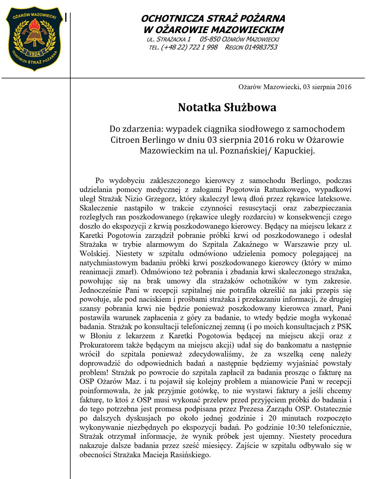 3 sierpnia w Ożarowie Mazowieckim doszło do zderzenia ciągnika siodłowego z samochodem Citroen Berlingo. W trakcie resuscytacji i opatrywania ran, strażak skaleczył się w dłoń. Doszło do ekspozycji z krwią poszkodowanego kierowcy. Będący na miejscu lekarz zalecił pobranie próbki do badań i odesłał strażaka do Szpitala Zakaźnego przy ulicy Wolskiej w Warszawie. Tu odmówiono zbadania próbki krwi, a także pobrania i zbadania krwi strażaka. Ostatecznie musiał On sam zapłacić za badania.