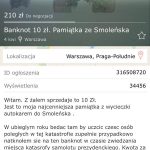 W ubieglym roku bedac tam by uczcic czesc osób poległych w tej katastrofie zupełnie przypadkowo natknołem sie na ten banknot w czasie zwiedzania miejsca katasrofy samolotu prezydenckiego. Kwota za ten banknot moze i jest wygórowana ale dla mnie jako studentowi pozwoli uczestniczyc w kolejnej wyciece parafialnej.”