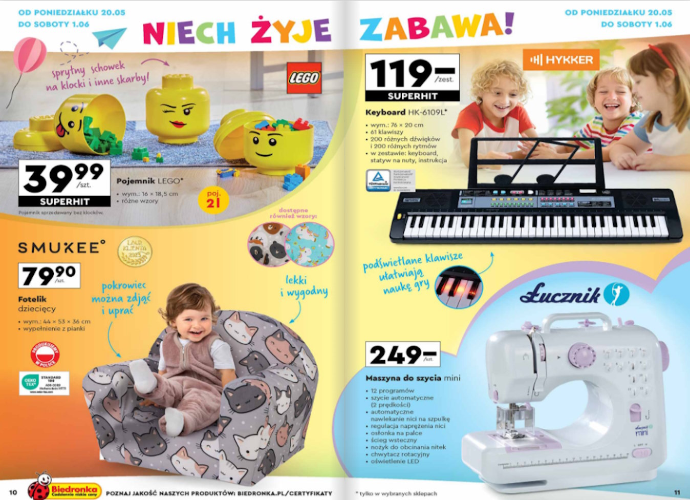 Nie przegap superhitów dla dzieci i odwiedź najbliższą Biedronkę już od poniedziałku. Skorzystaj z rewelacyjnych ofert na pojemniki LEGO, foteliki dziecięce, keyboardy i maszyny do szycia. Takie okazje zdarzają się rzadko, więc nie zwlekaj i przygotuj się na udane zakupy!