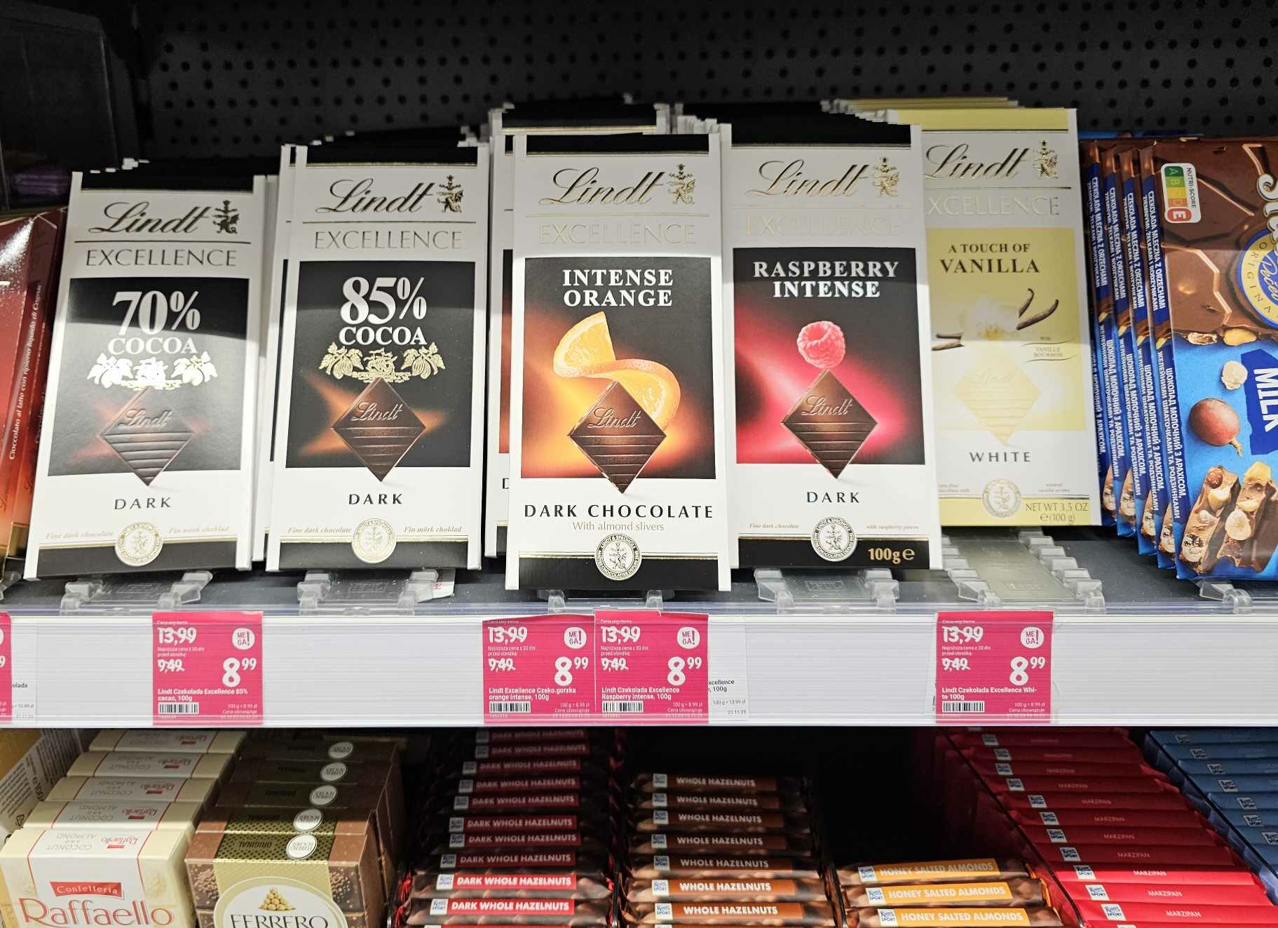 • Czekolada Lindt Excellence Raspberry Intense – dla miłośników połączenia ciemnej czekolady z owocową nutą malin.
