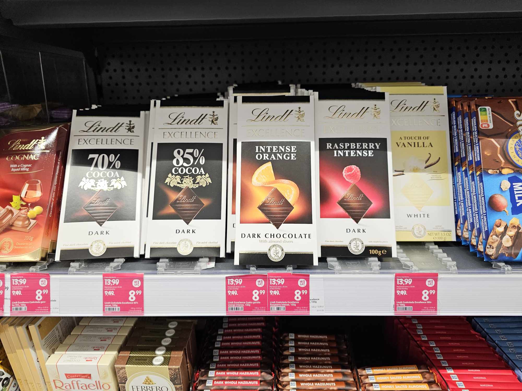 • Czekolada Lindt Excellence Raspberry Intense – dla miłośników połączenia ciemnej czekolady z owocową nutą malin.