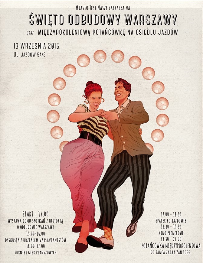 13 września, w niedzielne popołudnie, na terenie Osiedla Jazdów odbędzie się wielkie święto odbudowy Warszawy. 70 lat temu stolica powstała z gruzów niczym Feniks z popiołów, co zasługuje na najwyższe wyrazy uznania i dumę dzisiejszych warszawiaków. Czekamy na Was z darmową legendarną oranżadą, pańską skórką i mnóstwem innych atrakcji! Spotykamy się przy ul. Jazdów 5a/3!