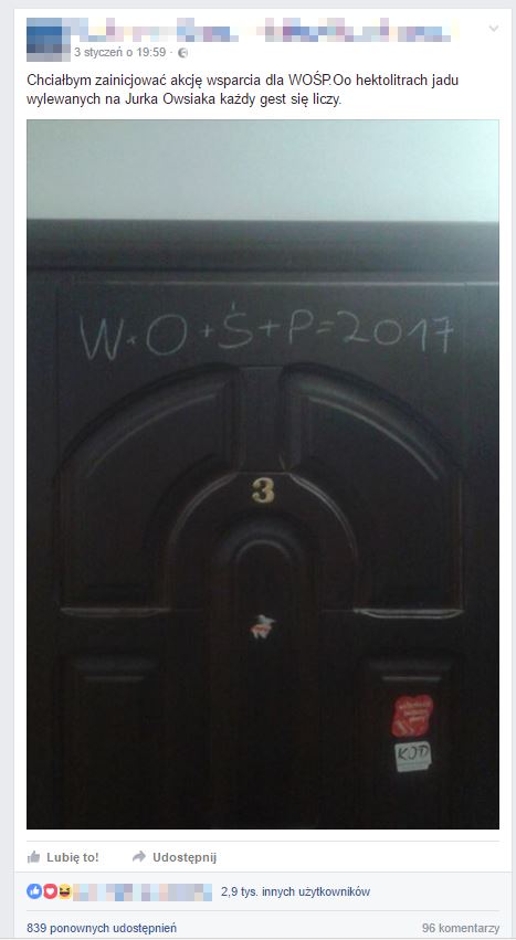 Na jednej z grup na Facebooku skupiających sympatyków KOD jeden z użytkowników proponuje, aby zamiast pisania K+M+B pisać na drzwiach W+O+Ś+P, jako symbol poparcia dla Jurka Owsiaka. Pomysł spotkał się z ogromną aprobatą i udostępniono go ponad 800 razy.