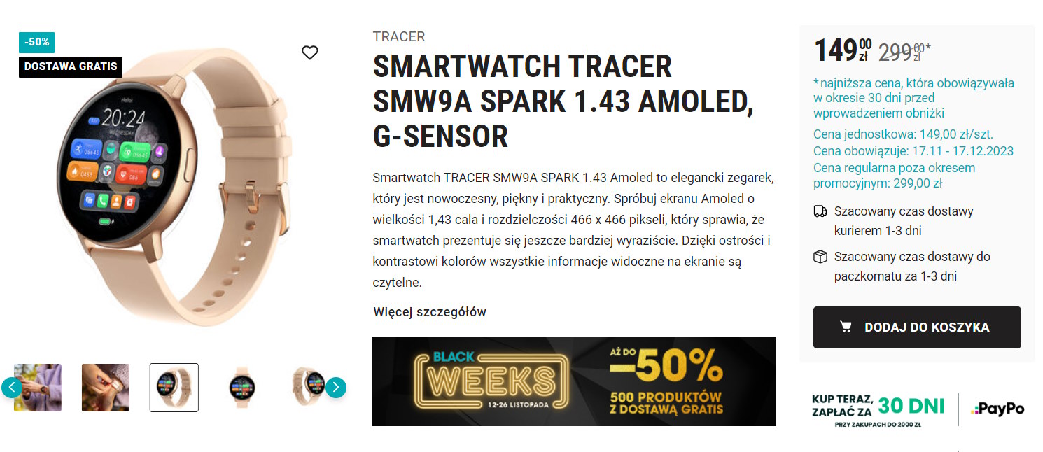 W ramach promocji Black Week, sieć sklepów Biedronka wprowadziła wyjątkową ofertę na smartwatch Tracer SMW9A Spark. Urządzenie to, oferowane z 50% zniżką i darmową dostawą, jest teraz dostępne za 149 zł, znacznie taniej od pierwotnej ceny 299 zł.