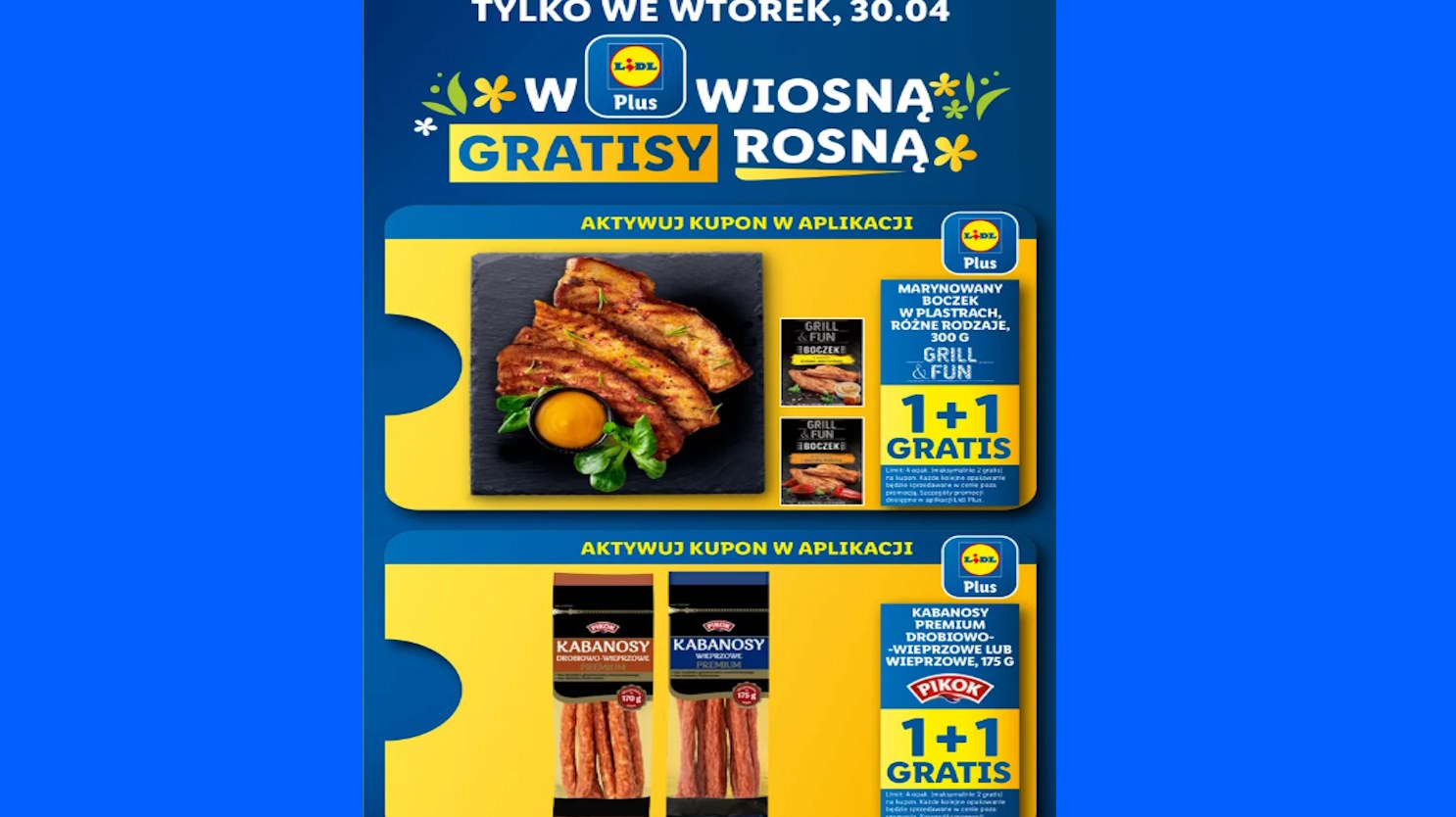 Nie zabraknie także pyszności, które z pewnością znikną z grillowego rusztu w mgnieniu oka. Marynowany boczek w plastrach oraz różne rodzaje kiełbas także objęte są promocją 1+1 gratis. Zapomnij o nudnych daniach – dzięki Lidlowi Twoja majówka nabierze wyjątkowego smaku!