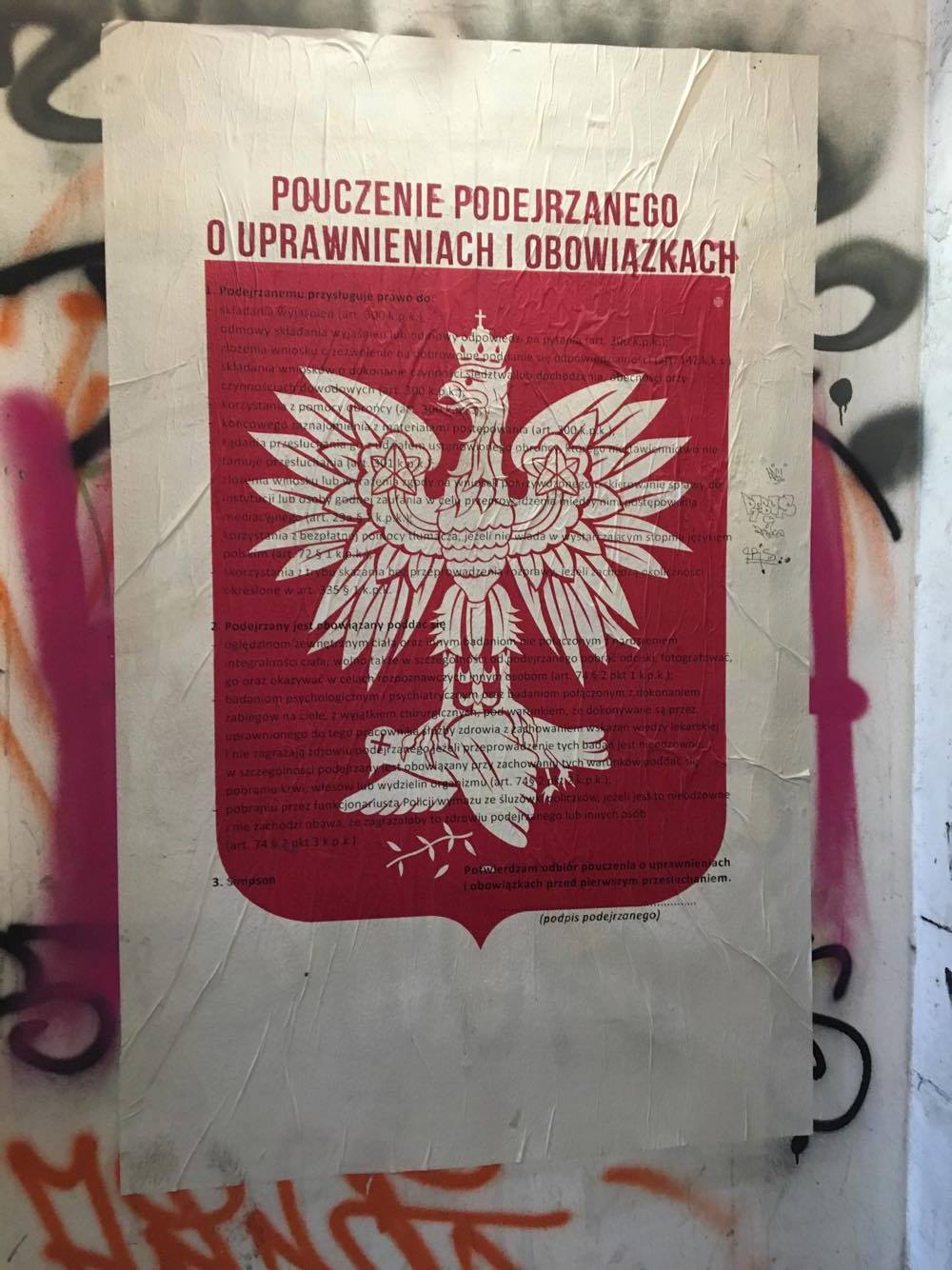 Wczoraj w godzinach popołudniowych nasz reporter zauwazył ogromny plakat przyklejony w bramie kamienicy przy Alejach Jerozolimskich 32, tuż przed wejsciem do Kuratorium Oświaty w Warszawie. Przedstawia on orła w koronie z krzyżem depczączego gołąbka pokoju.Wszystko to na tle szablonu „Pouczenie podejrzanego o uprawnieniach i obowiązkach”.