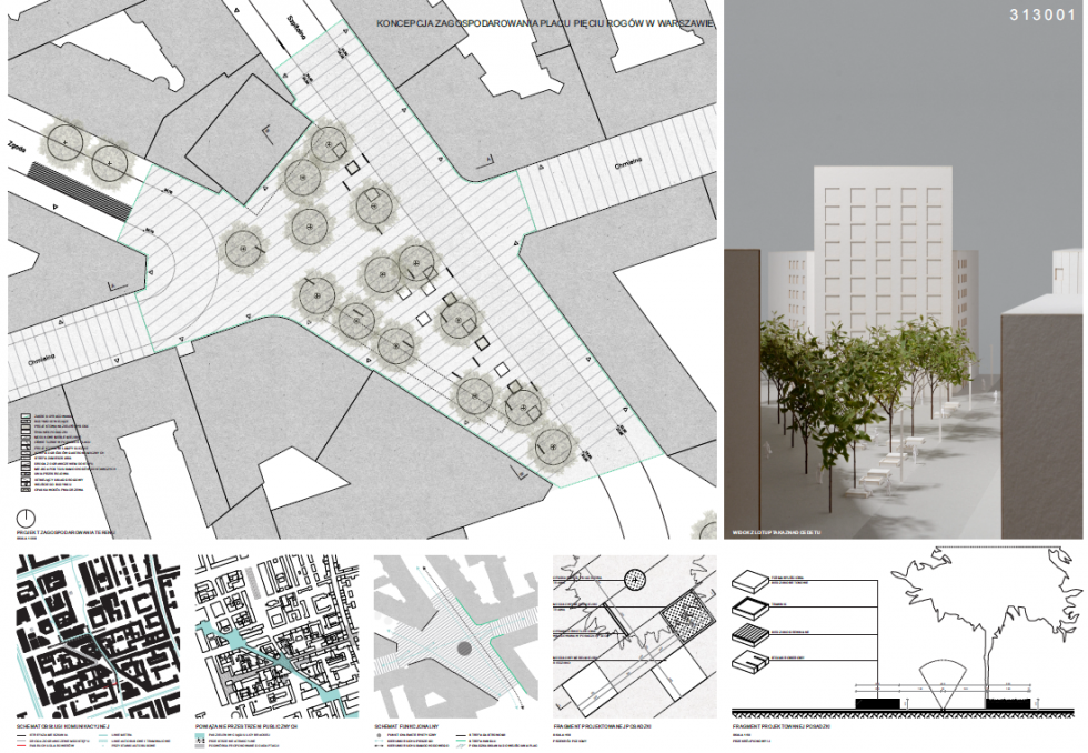 Konkurs architektoniczno-urbanistyczny na opracowanie koncepcji zagospodarowania Placu Pięciu Rogów ogłoszono 21 czerwca br. Wpłynęło 30 prac, które ocenił sąd konkursowy w składzie: Renata Kaznowska – zastępca Prezydenta m. st. Warszawy, Marek Mikos i Wojciech Wagner – zastępcy dyrektora Biura Architektury i Planowania Przestrzennego, Mieczysław Reksnis – dyrektor Biura Drogownictwa i Komunikacji, Andrzej Chołdzyński – architekt, Marek Szeniawski, Sławomir Gzell i Michał Tatjewski – OW SARP, Jacek Jedynak – architekt, Bogdan Wyporek – Towarzystwo Urbanistów Polskich i Patryk Zaremba – Stowarzyszenie Forum Rozwoju Warszawy.