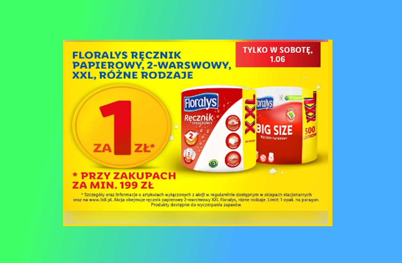 Lidl nie przestaje zaskakiwać swoich klientów atrakcyjnymi promocjami. Tym razem, tylko w sobotę, 1 czerwca, miłośnicy okazji mogą skorzystać z wyjątkowej oferty na ręczniki papierowe marki Floralys. Lidl oferuje te popularne i praktyczne produkty w rekordowo niskiej cenie – tylko 1 zł za opakowanie, przy zakupie za minimum 199 zł.