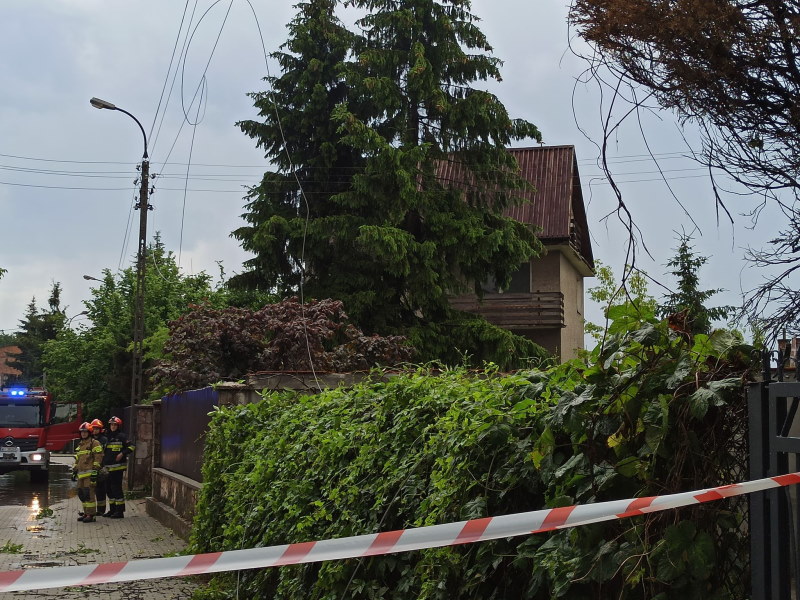 Lokalnie mogą występować problemy z dostawą energii elektrycznej. Wyłączone jest zasilanie, a okolica zabezpieczona. Służby usuwają drzewo. Potem nastąpi naprawianie awarii i przywrócenie zasilania.