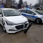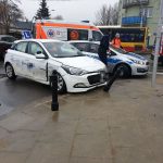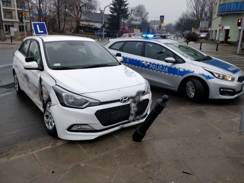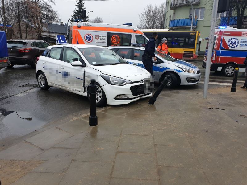 Samochód marki hyundai należący do nauki jazdy zderzył się z autem osobowym marki jaguar. Ten pierwszy odbił się jeszcze i uderzył w słupek.