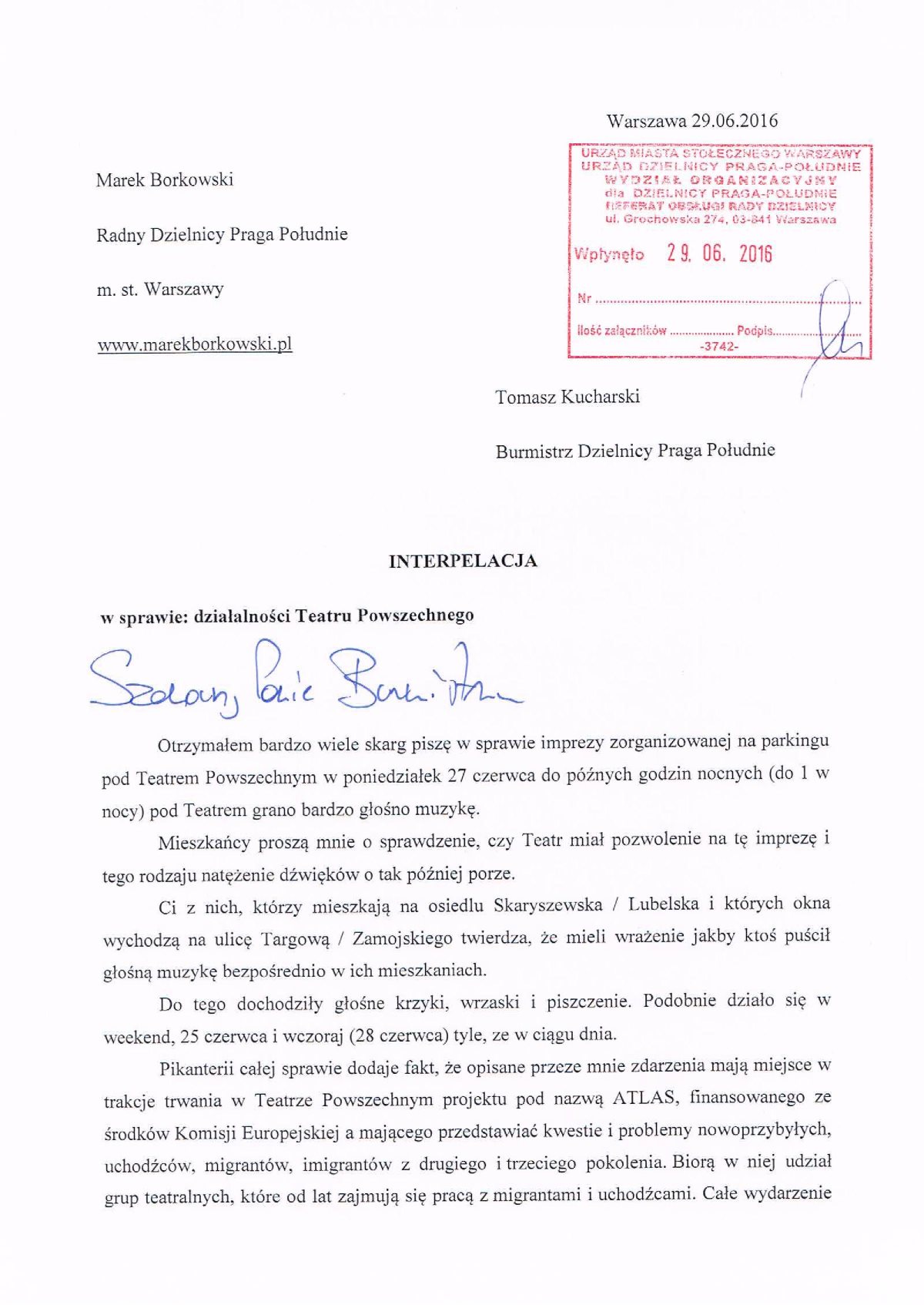 Radny skontaktował się z dyrekcją Teatru Powszechnego, która przyznała, że: „(…) Rzeczywiście w poniedziałkowy wieczór wydarzenia na zewnątrz Teatru przeciągnęły się znacznie dłużej niż były zaplanowane. Staramy się na bieżąco przepraszać sąsiadów za niedogodności i prosić o wyrozumiałość. Nasz Teatr w ramach międzynarodowego festiwalu teatralnego właśnie gości artystów i wykonawców z kilkunastu krajów, radość spotkania, emocje związane z prezentacjami spektakli, przeciągały się poza zwyczajowe godziny. Obiecuję nie dopuszczać do takich sytuacji w przyszłości, podjąłem już w tej sprawie kroki dyscyplinujące. Jeszcze raz dziękuję za zwrócenie przez Pana uwagi na ten problem (…).”