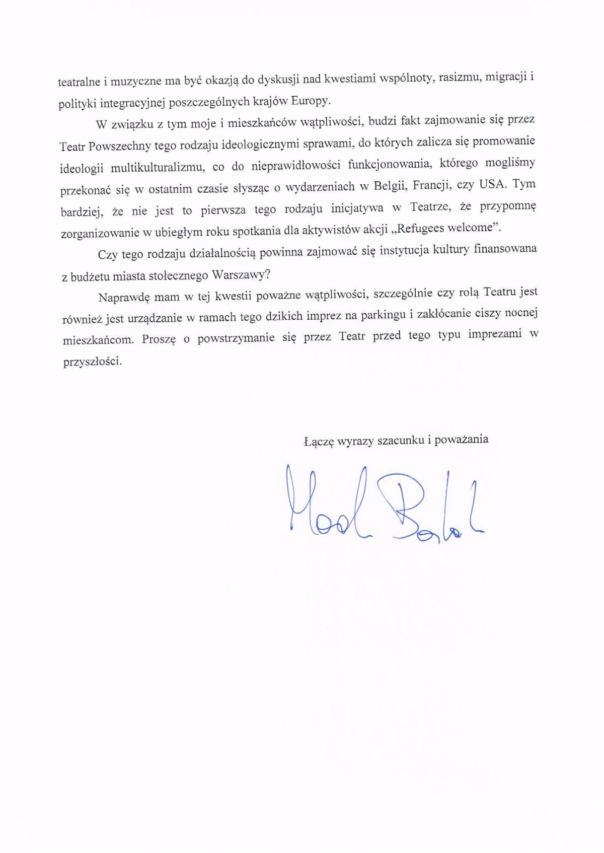 „Tym bardziej, że nie jest to pierwsza tego rodzaju inicjatywa w Teatrze, że przypomnę zorganizowanie w ubiegłym roku spotkania dla aktywistów, czyli akcji Refugees Welcome. Czy tego rodzaju działalnością powinna zajmować się instytucja kultury, finansowana z budżetu miasta stołecznego Warszawy?” – pyta nas Marek Borkowski.