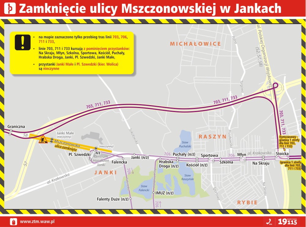 Należy pamiętać, że zamknięto też „stara ósemkę”, a więc Ci, którzy w Jankach skręcą na trasę nr 8 dojada tylko do estakad. Zmiany obejmą też autobusy. Autobusy linii 703, 711 i 733 – od 17 lipca br., od około godziny 22.00 do odwołania – będą kursowały trasami S2 i S8 z pominięciem odcinka na terenie Janek i Raszyna ograniczonego przystankami STOICKA – GRANICZNA. Zmiany są związane z zamknięciem dla ruchu ulicy Mszczonowskiej w Jankach i jednoczesnym otwarciem trasy S8 (obwodnica Janek i Raszyna).