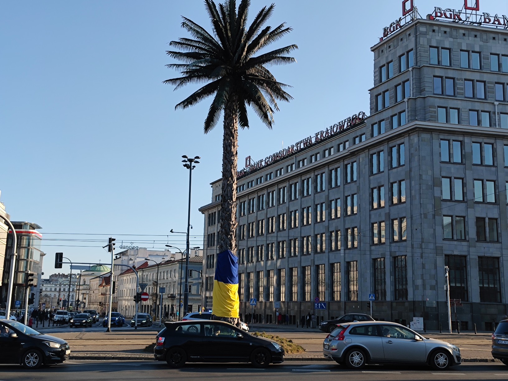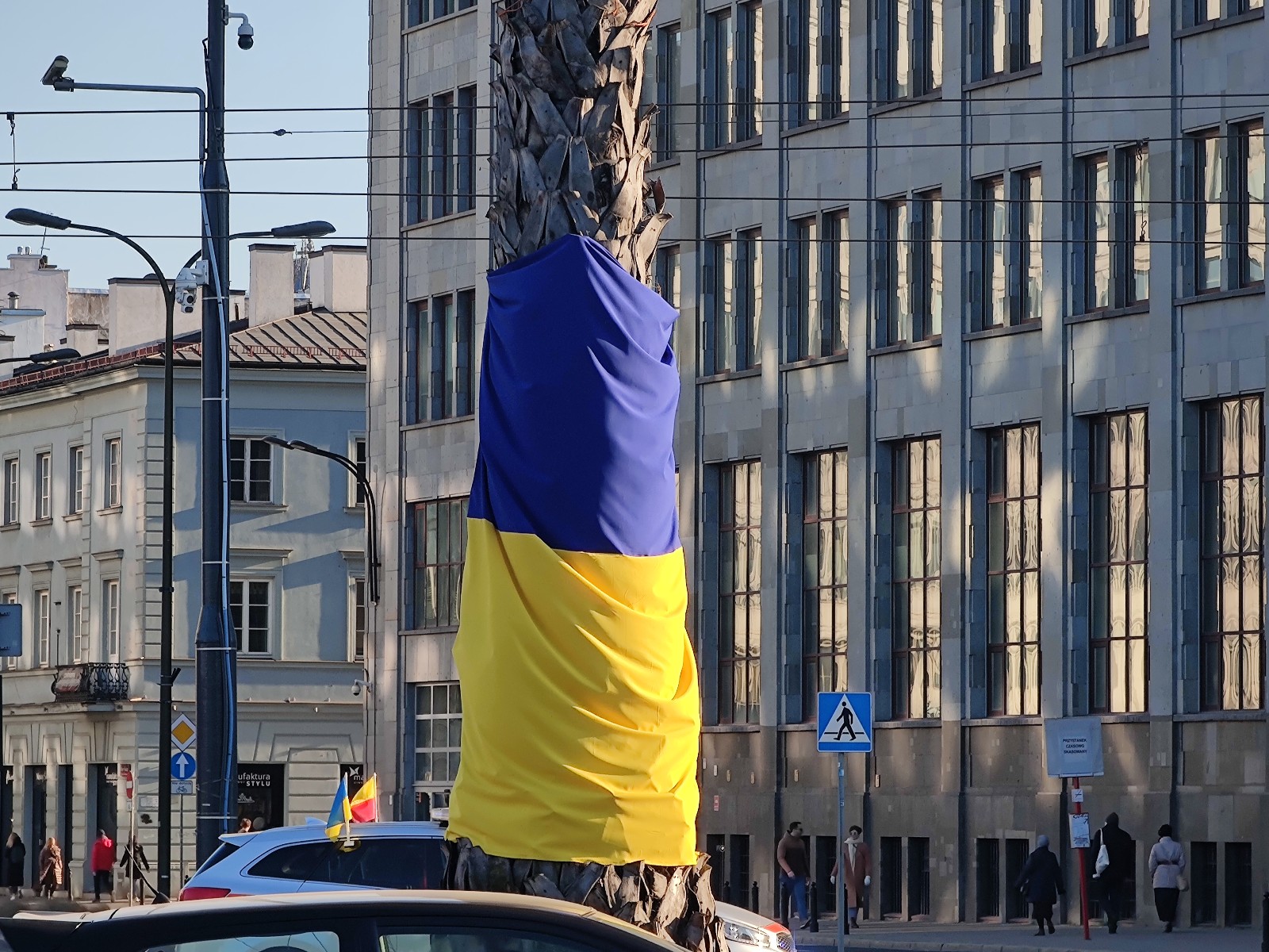 Tłum ludzi wokoło palmy robi zdjęcia. Ktoś zawiesił flagę