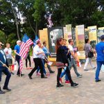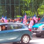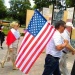 Tłumy ludzi idą na Plac Krasińskich. Niosą amerykańskie flagi. Służby w pogotowiu