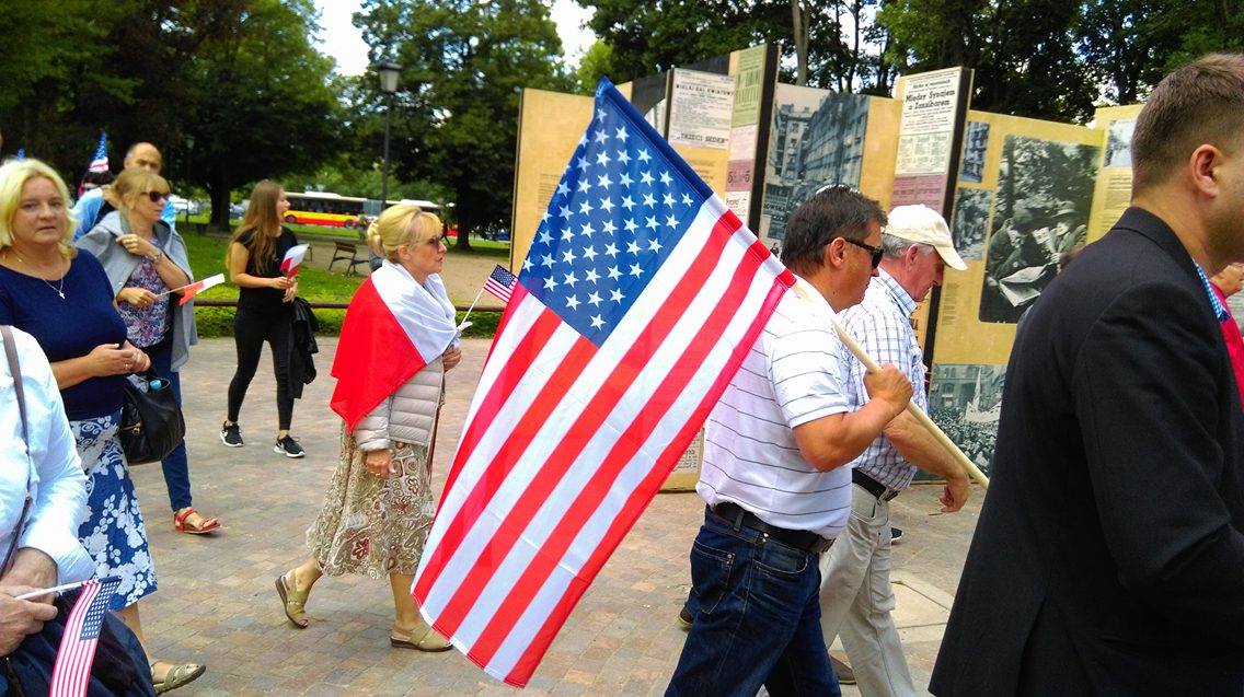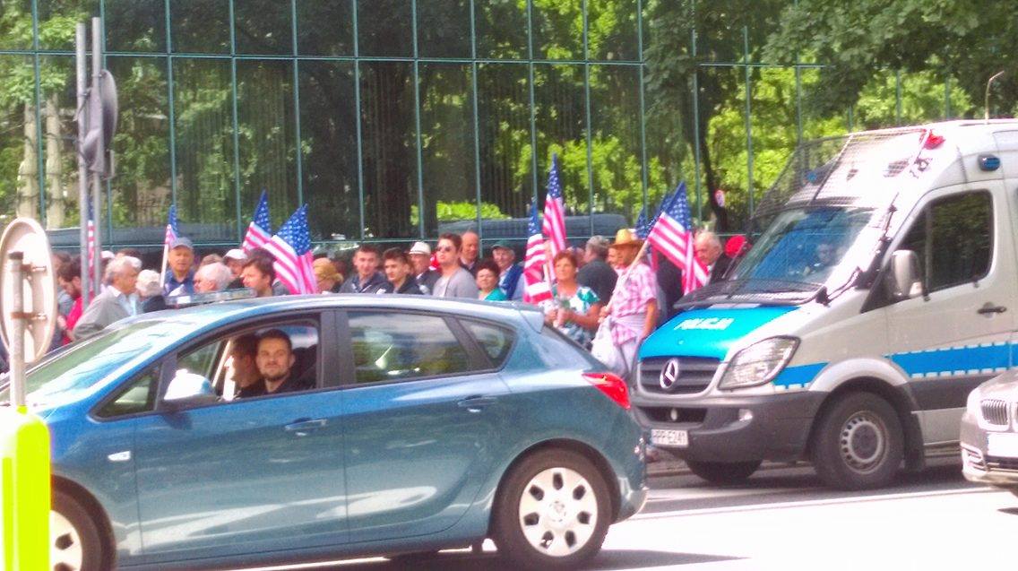 Tłumy ludzi idą na Plac Krasińskich. Niosą amerykańskie flagi. Służby w pogotowiu