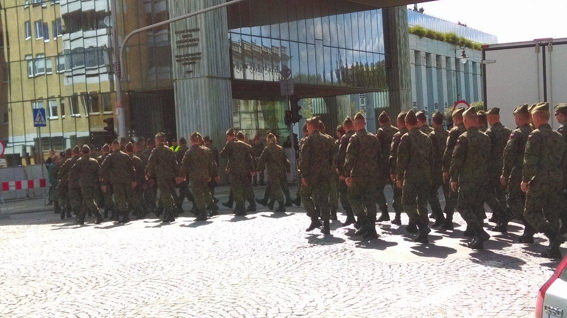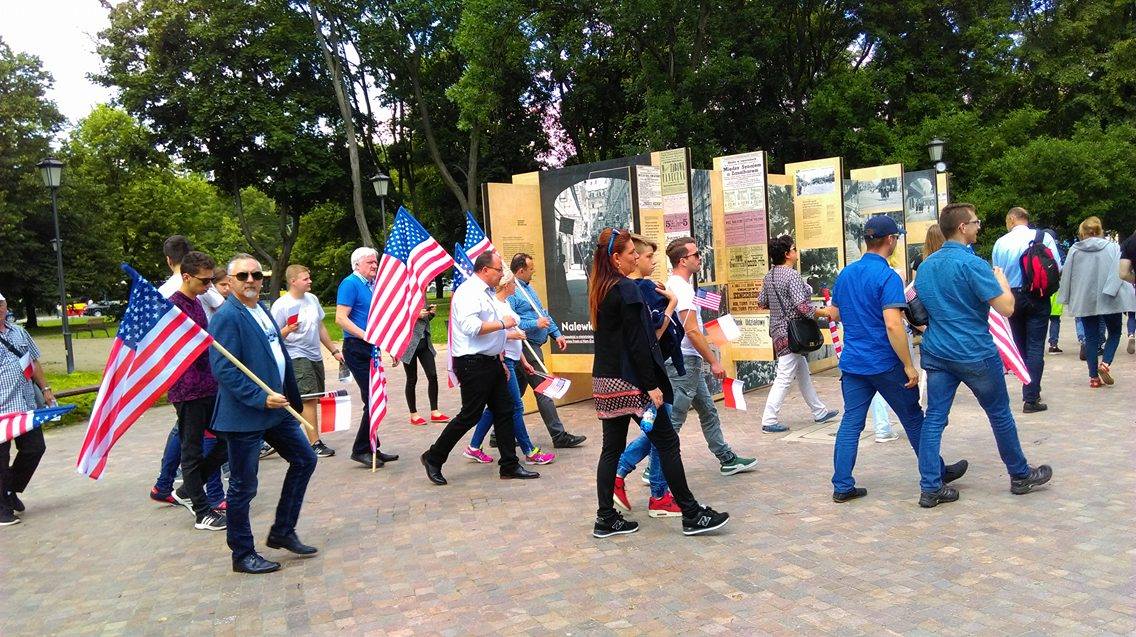 Tłumy idą w stronę Placu Krasińskich. Tam o 13:00 prezydent Stanów Zjednoczonych Donald Trump wygłosi pierwsze przemówienie w Europie. Teren wydarzenia zabezpiecza policja. Na miejscu jest też pogotowie i straż pożarna.