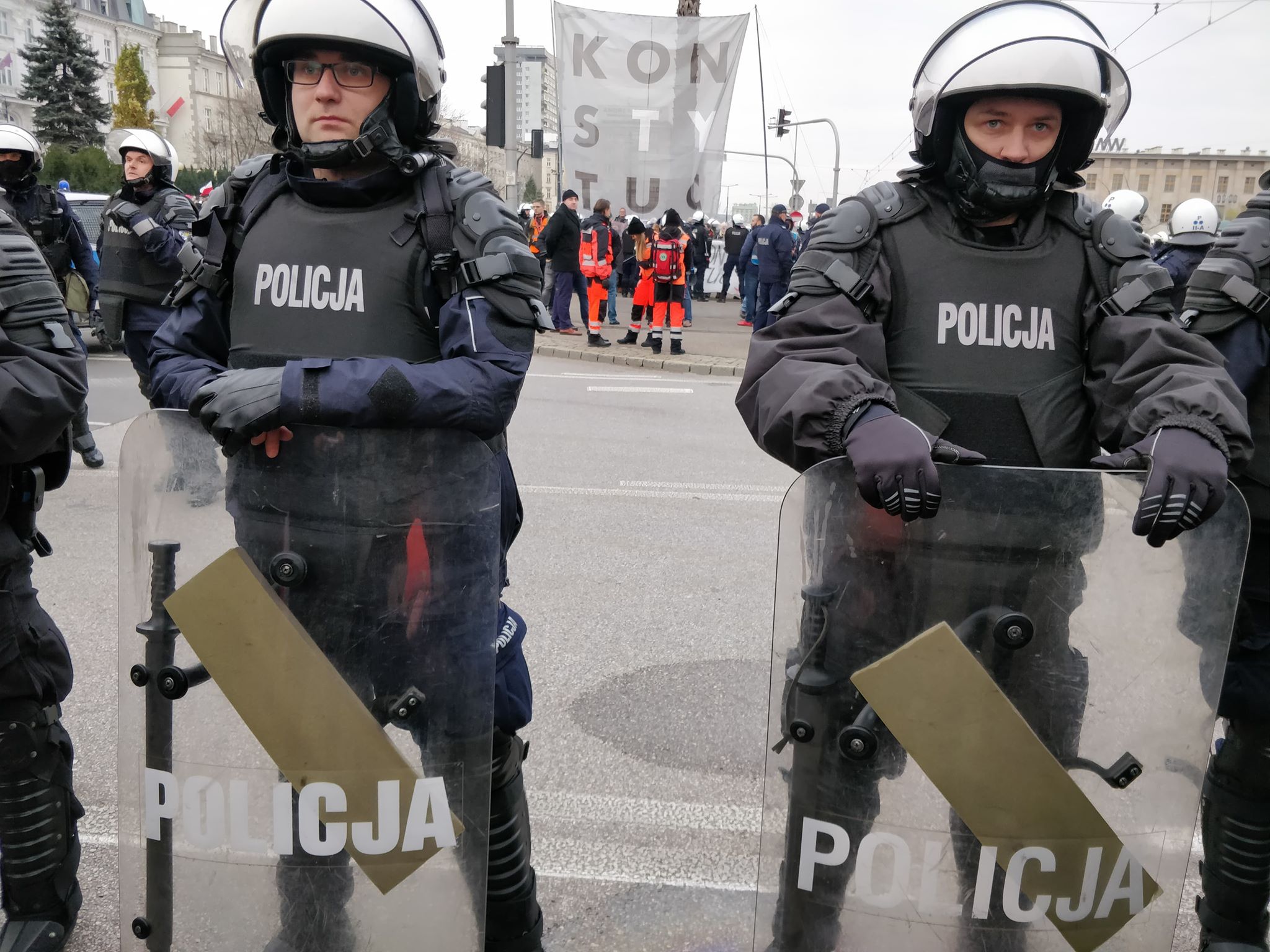 Na rondzie de Gaulle’a, pod palmą, stoją kontrmanifestanci z Obywateli RP, którzy zostali otoczeni przez policję. Najprawdopodobniej Marsz Niepodległości przejdzie po prostu obok nich.