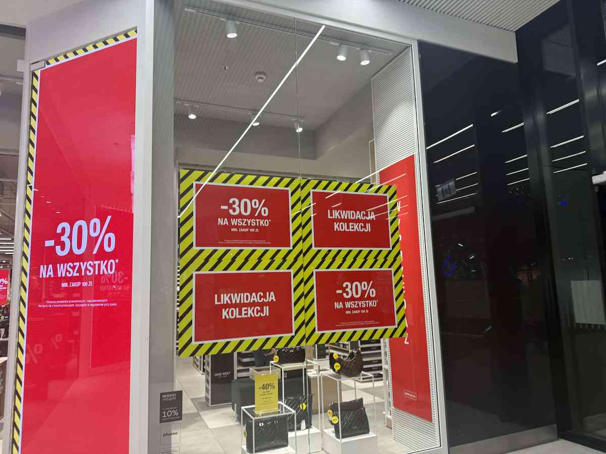 - CCC proponuje „-30% na wszystko” przy zakupie od 100 zł. Do tego plakaty stylizowane jak tablice ostrzegawcze – żółto-czarne ramki, czerwone wnętrze, wielkie hasła o likwidacji kolekcji. To ma wywołać efekt: „kup teraz, bo znika”.