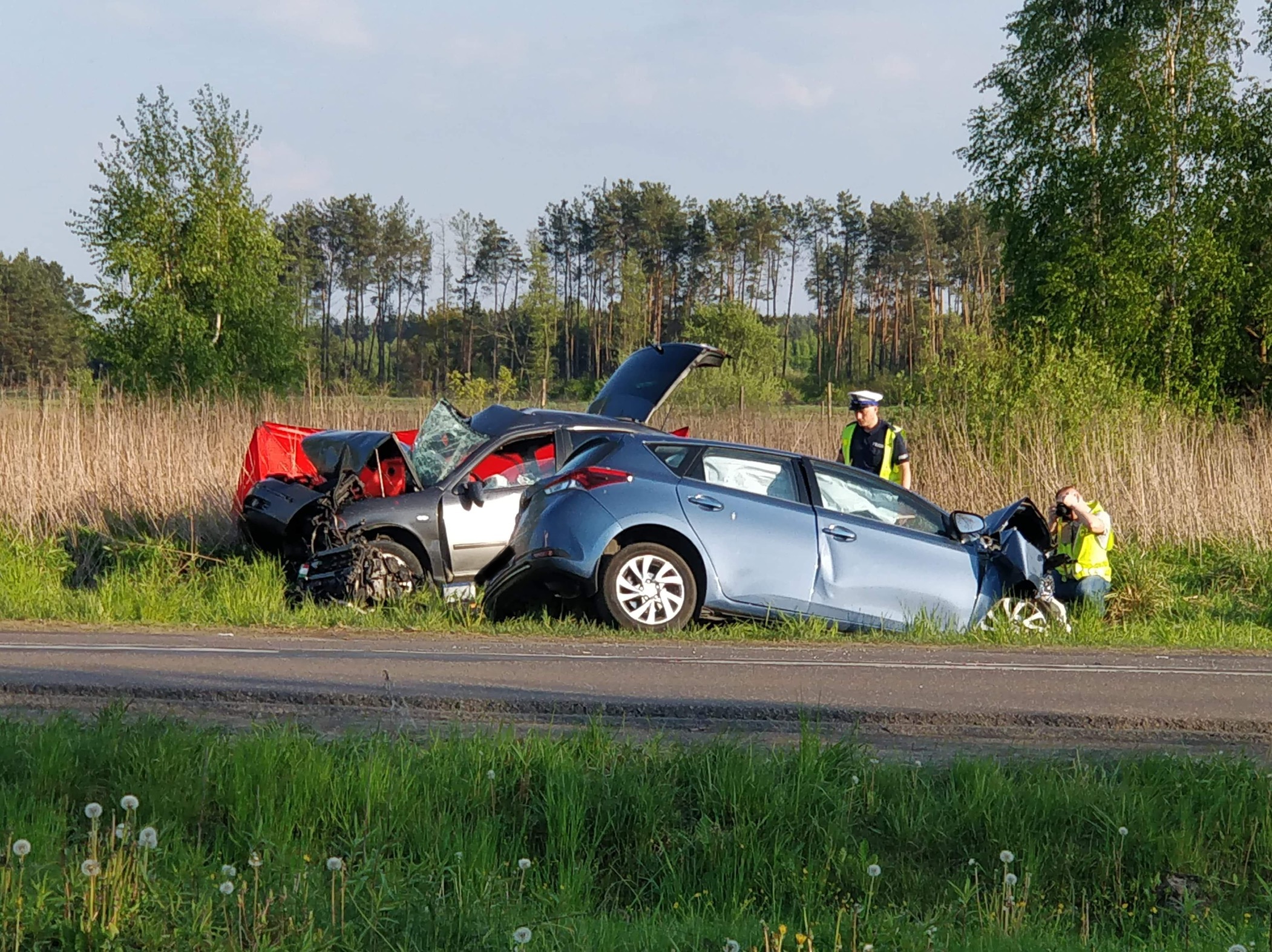 Na łuku drogi czołowo zderzyły się toyota i seat. Po zderzeniu oba auta znalazły się w rowie. Jedno z nich było na boku. Służby musiały postawić samochód na koła, by wydobyć z niego poszkodowanego.