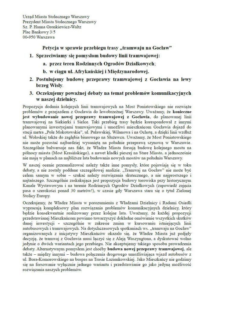 „Władze Miasta nas zlekceważyły. Nie zapytały o zdanie, a w dodatku nie prowadzą rzetelnej polityki informacyjnej nt. wizji rozwoju transportu w naszej dzielnicy.”– czytamy w oświadczeniu mieszkańców Pragi-Południe pod petycję skierowaną do prezydent Hanny Gronkiewicz-Waltz.