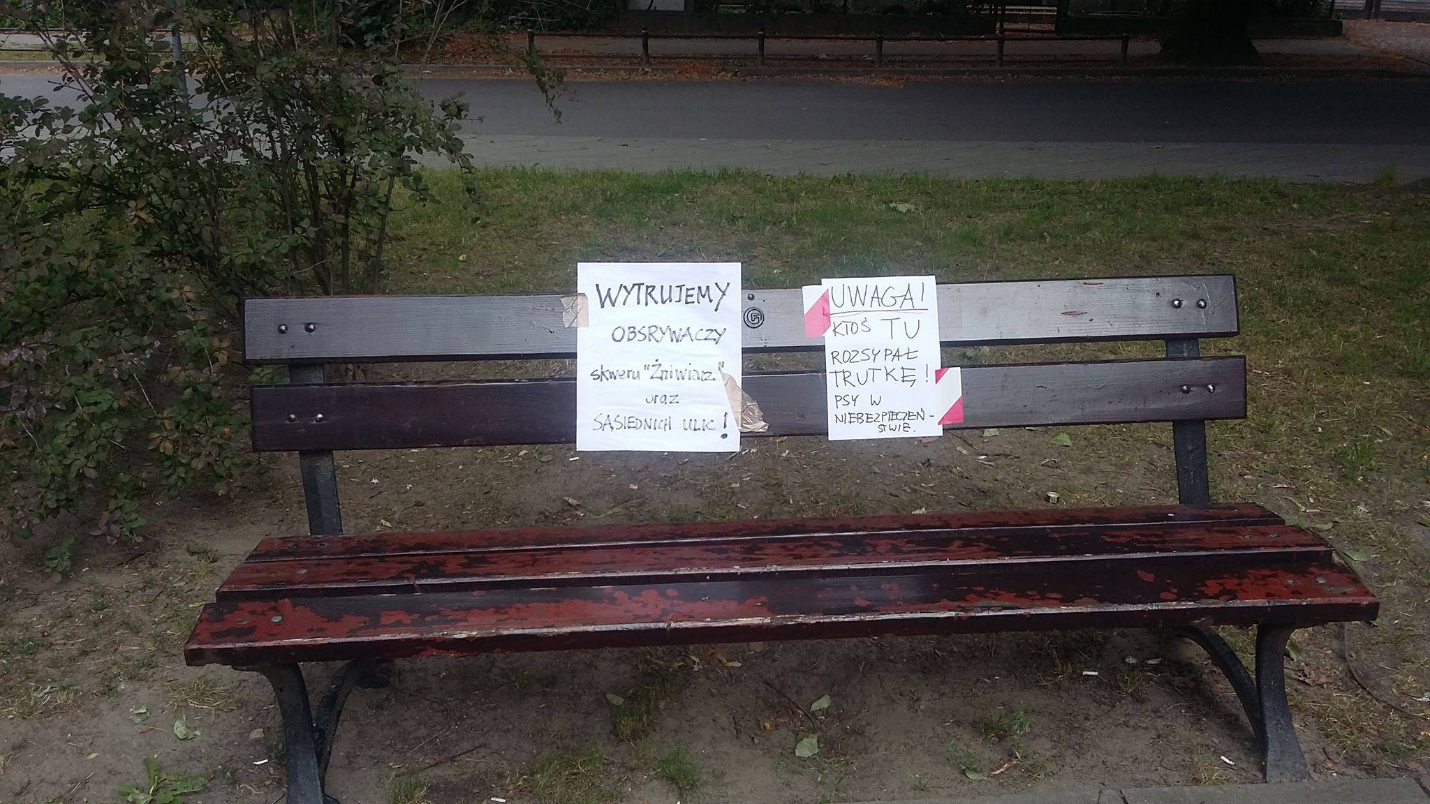Fanpage Żoliborz Moje Miasto umieścił zdjęcie ławki na której widać dwie przylepione kartki. Na jednej ktoś ostrzega przed trucicielami psów. Na drugiej ujawniają się sami sprawcy zatruć.