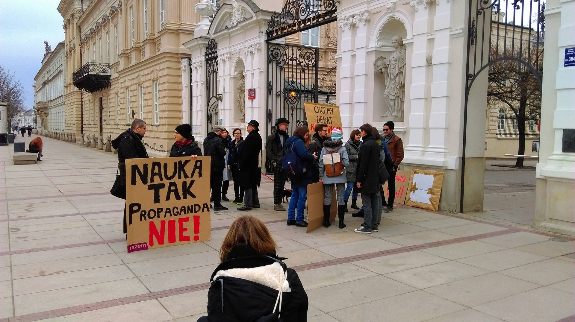 W dniu dzisiejszym miało odbyć się spotkanie z działaczką antyaborcyjną Rebeccą Kiessling. Organizatorami byli Koło Nauk o Państwie i Prawie „Pro Patria” wraz z Instytut na rzecz Kultury Prawnej Ordo Iuris. Mimo, iż Uniwersytet Warszawski zdecydował się odwołać spotkanie [LINK], studenci zrzeszeni w kole Uniwersytet Zaangażowany protestują pod bramą uczelni przeciwko jakiejkolwiek działalności Orgo Iuris na UW.