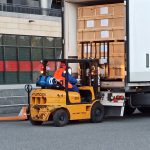 Skrzynie opuszczają ciężarówkę, by wkrótce powstał pierwszy szpital tymczasowy w Polsce.