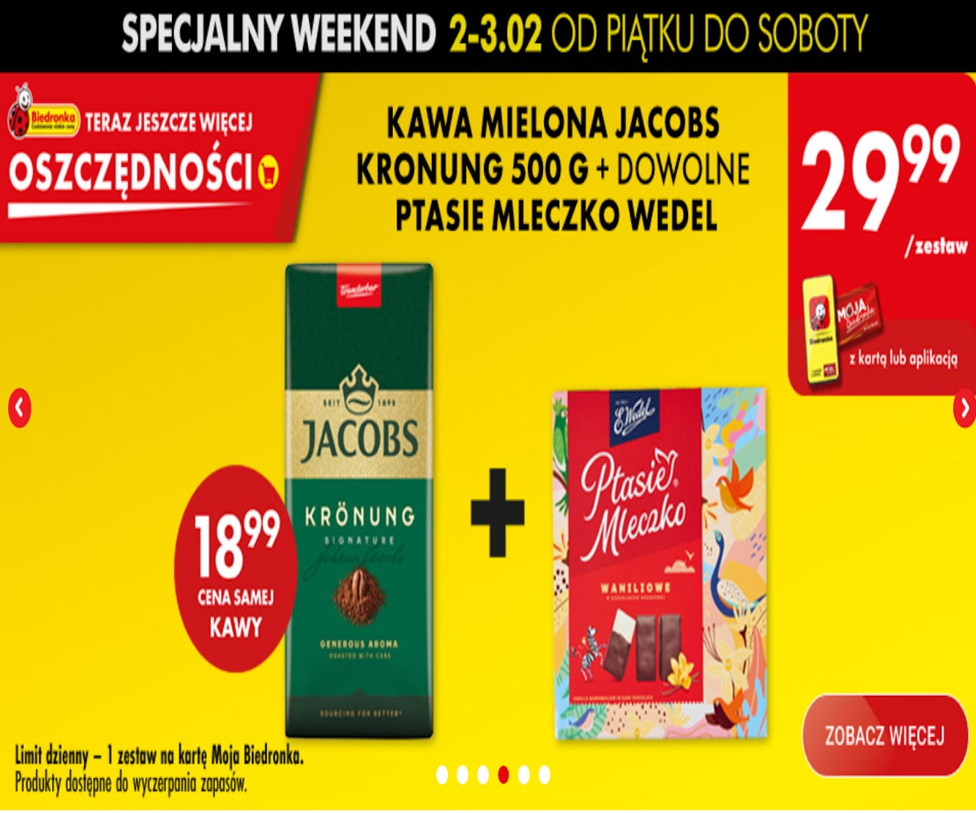 W każdym domu znajdzie się miejsce na małe przyjemności, szczególnie gdy można je zdobyć w promocyjnej cenie. Tego weekendu sieć sklepów Biedronka przygotowała specjalną ofertę, która z pewnością przyciągnie wielbicieli kawy i słodyczy. Tylko przez dwa dni, od piątku do soboty, 2-3 lutego, klienci mogą skorzystać z wyjątkowej promocji na zestaw kultowej mielonej kawy Jacobs Krönung o wadze 500 gramów w parze z dowolnym opakowaniem Ptasiego Mleczka Wedel.
