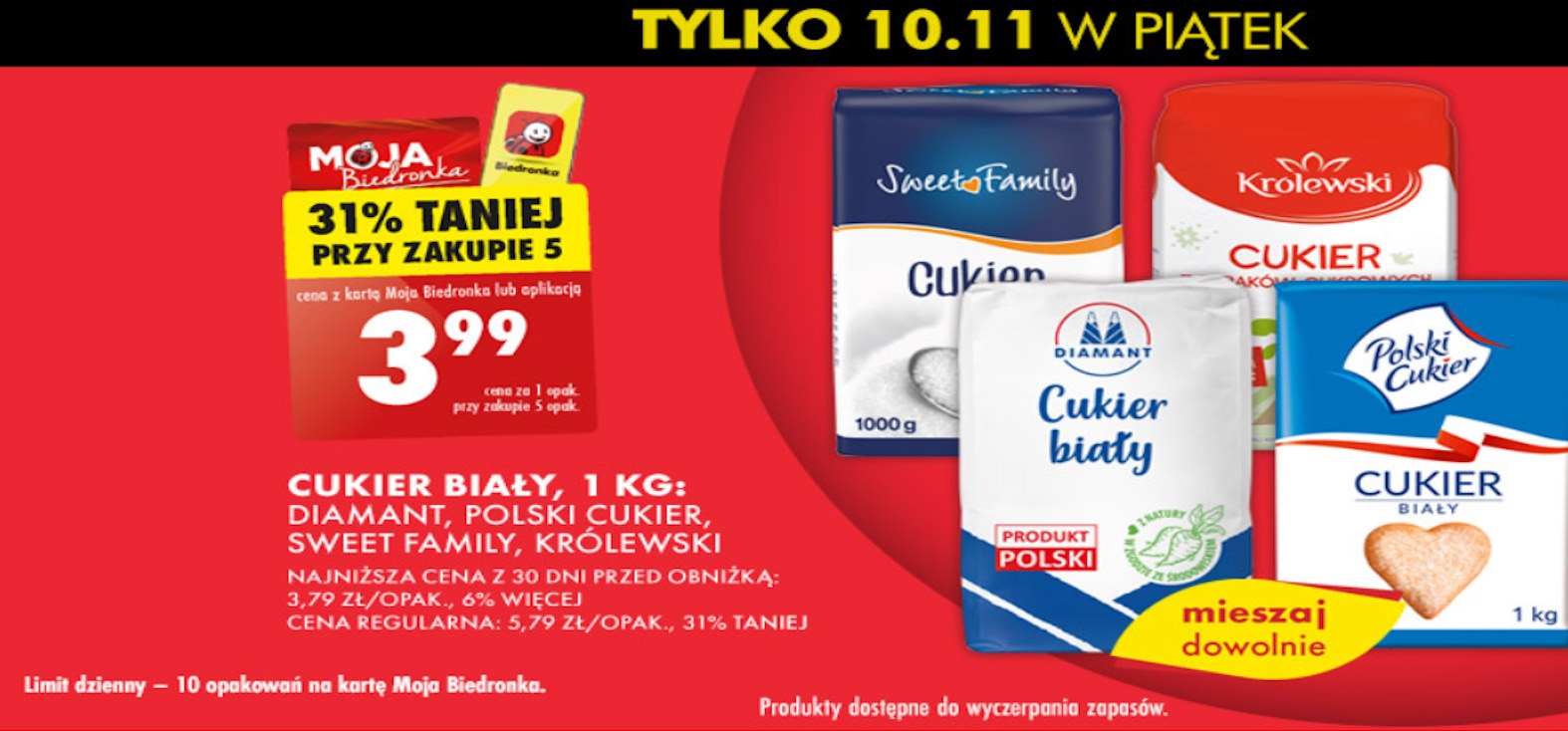 Promocja obowiązuje tylko w piątek, 10 listopada, i jest dostępna dla posiadaczy karty Moja Biedronka lub użytkowników aplikacji. Limit dzienny zakupu to 10 opakowań cukru na jedną kartę Moja Biedronka. Oferta obowiązuje do wyczerpania zapasów, co podkreśla konieczność szybkiego skorzystania z promocji.