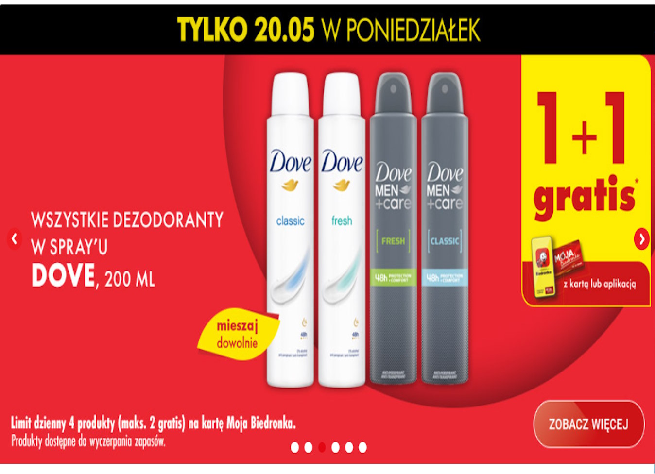 W poniedziałek, 20 maja, Biedronka przygotowała dla swoich klientów wyjątkową promocję, która z pewnością przyciągnie rzesze kupujących. Tego dnia wszystkie dezodoranty w spray’u marki Dove (200 ml) będą dostępne w rewelacyjnej ofercie 1+1 gratis. To doskonała okazja, aby zaopatrzyć się w ulubione kosmetyki w atrakcyjnej cenie.